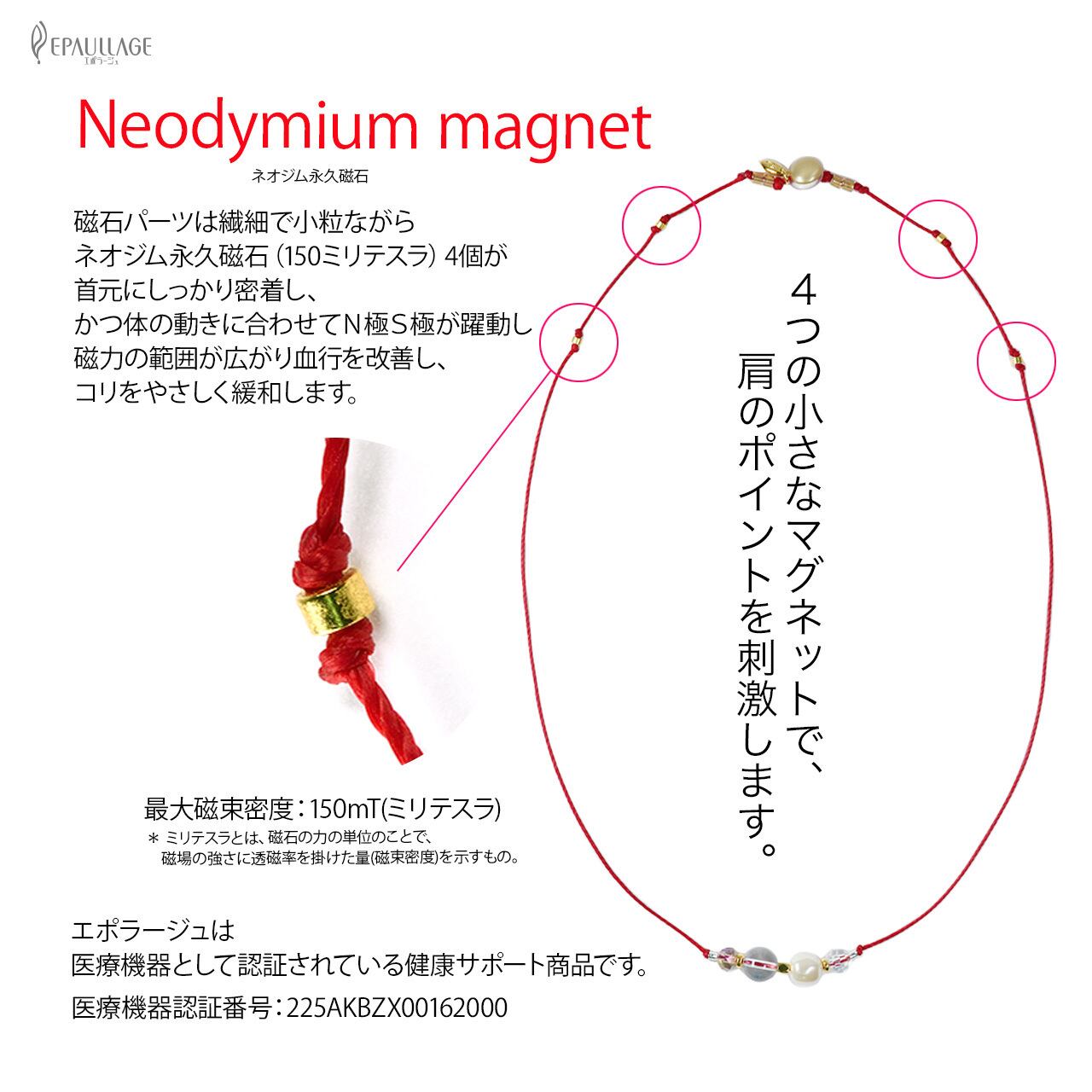 エポラージュ磁気ネックレスは、永久磁石を独自の技法とN極・S極の配列で仕上げた、医療機器として正式に認証された商品です。